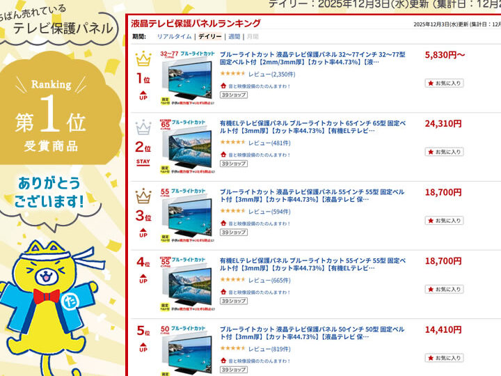 これら全てについて考慮しながら、自分たちに最適なテレビ 保護パネルをご検討いただくことで、大切なテレビを効果的に守ることができます。上部の商品比較欄では各商品の特徴や互換性について詳しい情報がありますので、ご活用ください。