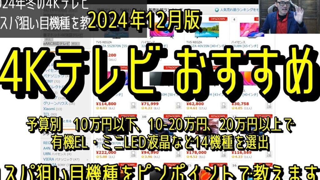 最新の4Kテレビでは、このように画質と音質ともに非常に多様な選択肢があります。それぞれの商品については上部の比較表をご覧いただければ、どこで自分に最適なテレビを見つけられるか理解できるでしょう。この情報を基に、おすすめ商品から理想的な1台をぜひ見つけてください。