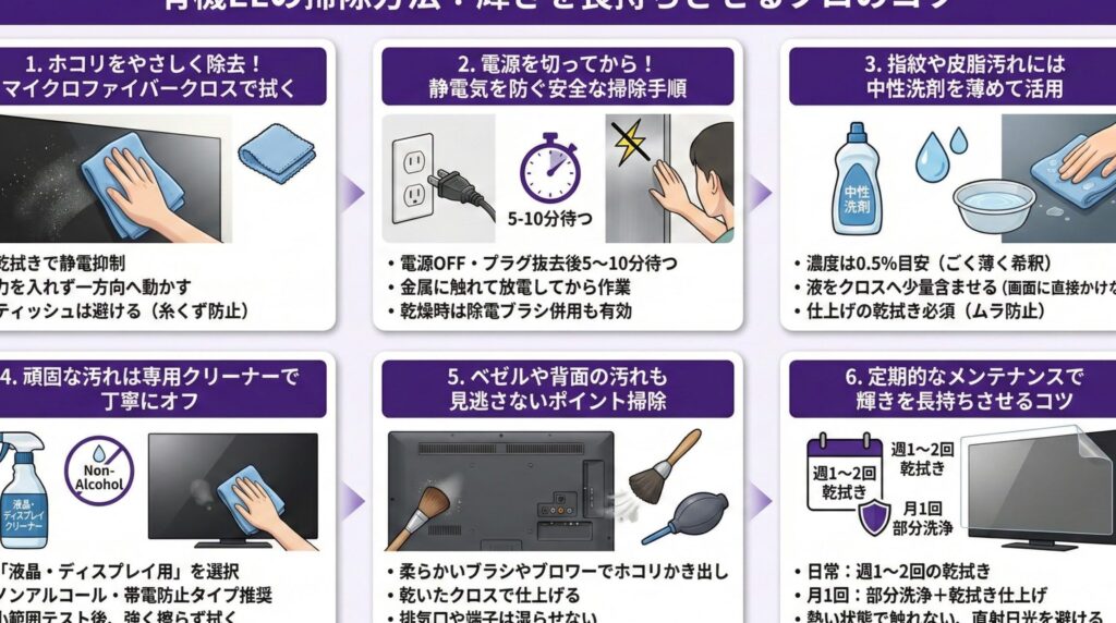 まずは基本的な掃除手順です。このプロセスを守ることで、テレビ画面に傷や汚れが残りにくくなります。